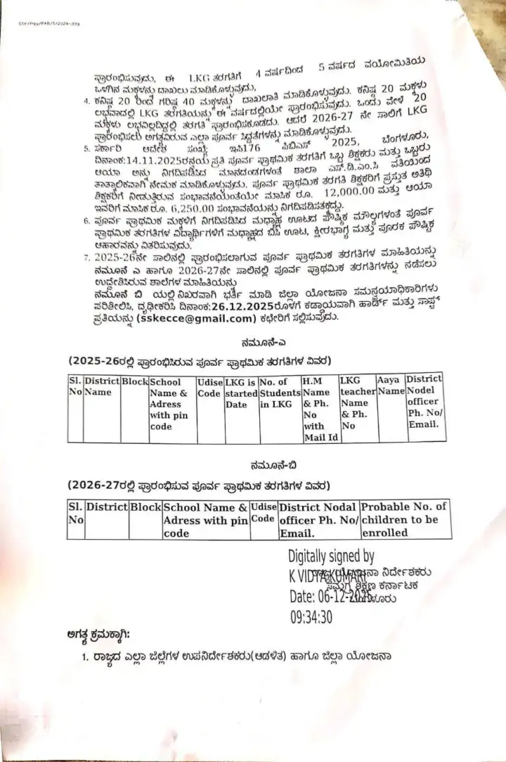 2025-26ನೇ ಸಾಲಿನಲ್ಲಿ ಪ್ರಾರಂಭಿಸಲಾಗುವ ಪೂರ್ವ ಪ್ರಾಥಮಿಕ ತರಗತಿಗಳ ಮಾಹಿತಿಯನ್ನು ನಮೂನೆ ಎ ಹಾಗೂ 2026-27ನೇ ಸಾಲಿನಲ್ಲಿ ಪೂರ್ವ ಪ್ರಾಥಮಿಕ ತರಗತಿಗಳನ್ನು ನಡೆಸಲು ಉದ್ದೇಶಿಸಿರುವ ಶಾಲೆಗಳ ಮಾಹಿತಿಯನ್ನು ನಮೂನೆ ಬಿ ಯಲ್ಲಿ ನಿಖರವಾಗಿ ಭರ್ತಿ ಮಾಡಿ ಜಿಲ್ಲಾ ಯೋಜನಾ ಸಮನ್ವಯಾಧಿಕಾರಿಗಳು ಪರಿಶೀಲಿಸಿ, ದೃಢೀಕರಿಸಿ ದಿನಾಂಕ: 26.12.2025ರೊಳಗೆ ಕಡ್ಡಾಯವಾಗಿ ಹಾರ್ಡ್ ಮತ್ತು ಸಾಪ್ ಪ್ರತಿಯನ್ನು (sskecce@gmail.com) ಕಛೇರಿಗೆ ಸಲ್ಲಿಸುವುದು.
