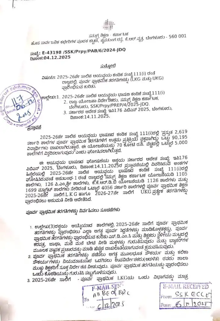 BREAKING NEWS : ರಾಜ್ಯದ `4056' ಸರ್ಕಾರಿ ಶಾಲೆಗಳಲ್ಲಿ `LKG, UKG' ಪ್ರಾರಂಭ : ಸರ್ಕಾರದಿಂದ ಮಹತ್ವದ ಆದೇಶ